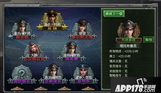 除了攻城之外,指挥官们还能凭借自己的实习和拥戴程度,叫上三两好友一起进行军衔战,打赢上一任指挥官,你就会取而代之。官职越高,福利越高,最高的几个官职还有专属的国战技能!如果你当了总统,甚至可以忽略地图上的距离,指哪打哪直接兵临敌方首都城下,国战任务中好好利用可以起到出其不意的效果。