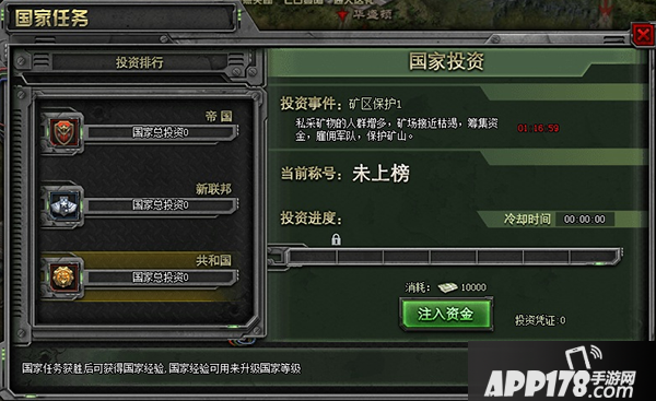 国家投资:玩家通过点击投资按钮提升国家投资排名,每次点击投资都会获得相应的经验奖励,同时活动结束后可获得经验奖励和国家经验拥有投资翻倍券,点击投资会自动使用,点击奖励的经验翻倍;