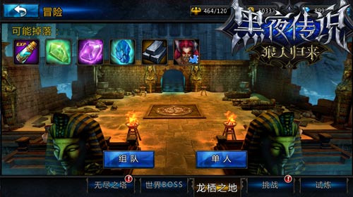 新的冒险玩法,在这里,掉落大量超值高级物品,如:经验药、能量石、幻化石、死亡预言碎片、六级陨铁、佣兵碎片!有四种难度,分别对应不同等级和掉落,可单人可组队攻打,可调整奖励倍数。