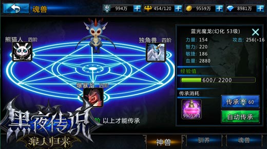 萌萌哒的神兽固然可爱,但是战斗力却不是十分的强劲,想要拥有强劲的力量,当然得升级进阶啦。无论是蓝光魔龙、雷电灵猫还是烈火狂牛都拥有极高的属性,升级可以提高神兽等级,而神兽每20级可以进化一次,必须进化后才能继续升级哦。