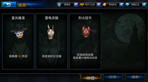 你说你的魂兽全都升级到了满级没有追求了?别急,你一定想要这几只神兽!独角兽达到三阶可以得到第一只神兽蓝光魔龙,达到一定的竞技积分可使用竞技点数购买第二只神兽雷电灵猫,战场胜利一定的场次可获得第三只神兽烈火狂牛!每只神兽均拥有极高属性,同时消耗一定的物品可进行传承升级以及进化升阶改变形态!