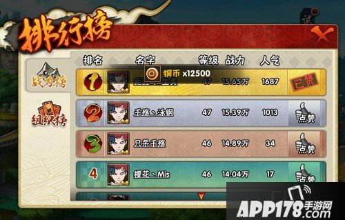 排行榜分为组织榜和战力榜两种,在战力榜中可以为你喜欢的角色点赞,从而获得大量铜币,被点赞的小伙伴也有相应收益(可看出战力值是非常重要的),小编目前点赞可获得1W+铜币,虽然每天只有一次坚持不懈才是王道啊。
