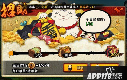 招财也是获得铜币的一种途径,每日首次招财时花费为0,后续再招财需要10金币,招财5次、10次和20次后分别对应有大量铜币赠送。通过小编计算招财10次花费160金币相对来说没有单次招财划算,单次花费金币招财需要100金币,而连续招财10次花费160金币。