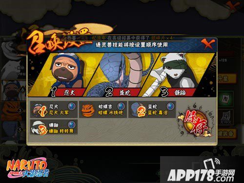 首先出场一般都是人海战术的忍者,各个忍者会一下出现,使用忍犬的大军技能,扫除部分敌人。这个技能永远放在第一个,虽然是第一个获得通灵兽,实战性还是很高的。小编还是非常喜欢用这个技能的,用着顺手又伤害高。