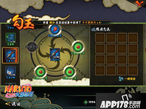游戏中勾玉系统是应装备系统而生的,各色勾玉镶嵌于装备上属性加成更给力哦,装备属性附加值的重要存在。每个装备五个插槽,且勾玉可以通过合成升级,叠加后的属性加成不容小觑哦