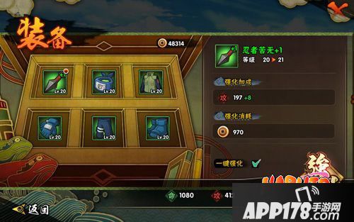 每位玩家固定拥有了六大装备分别是忍者苦无、忍者护额、忍者服、忍者护手、忍者裤、忍者靴。这些忍具对属性加成也不全都一样,苦无全面加攻属性、裤全面加防属性、鞋全面加命属性;护额增加攻、防属性,衣服增加防、命属性,护手增加攻、命属性。所以可以根据玩家需求来针对性强化进阶装备哦,是选择输出还是肉盾都由自己来掌握。