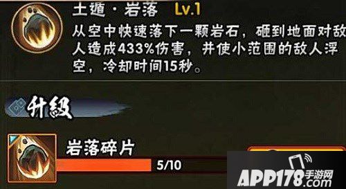 虽然一开始就拥有这个技能,不过土遁·岩落的技能碎片不太好收集,在小队突袭中,随机掉落的土遁·岩落技能书比较少,当然,每个人的运气不同,有的人可能一直不掉落,有的人则一直掉落,但总体给我个人的感觉是,很难掉落。