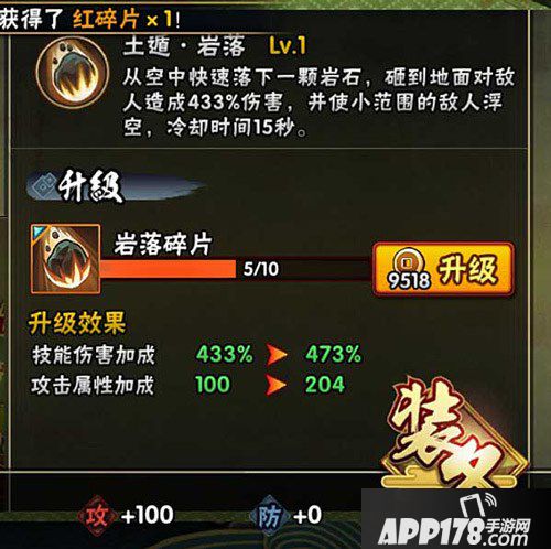 虽然一开始就拥有这个技能,不过土遁·岩落的技能碎片不太好收集,在小队突袭中,随机掉落的土遁·岩落技能书比较少,当然,每个人的运气不同,有的人可能一直不掉落,有的人则一直掉落,但总体给我个人的感觉是,很难掉落。