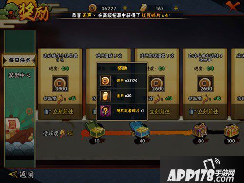 每天通过每日任务获得活跃度,从而得到活跃奖励,当活跃分别达到40、80和100的时候都有金币奖励。