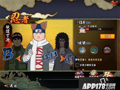 丁次是名副其实的近战型忍者,从他的普攻推手和肉弹战车都可以看得出来,而且他的普攻技能攻击在操作上要求比较高哦,如果你的方向操作不到位,很有可能攻击无效。奥义技能还是相当不错的,倍化后有一次重型扫击(若是遇到堪九郎傀儡类BOSS就要注意了)。