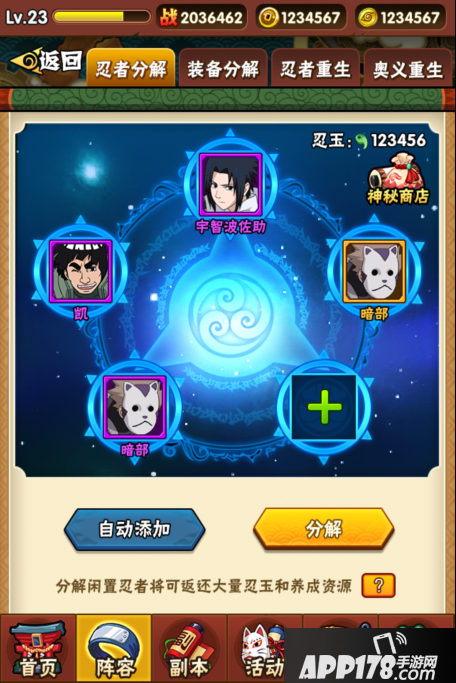 忍者大师推出了特别的分解系统,玩家可以把没有用的忍者或者装备进行分解,产出忍玉,去神秘商店兑换新的忍者。