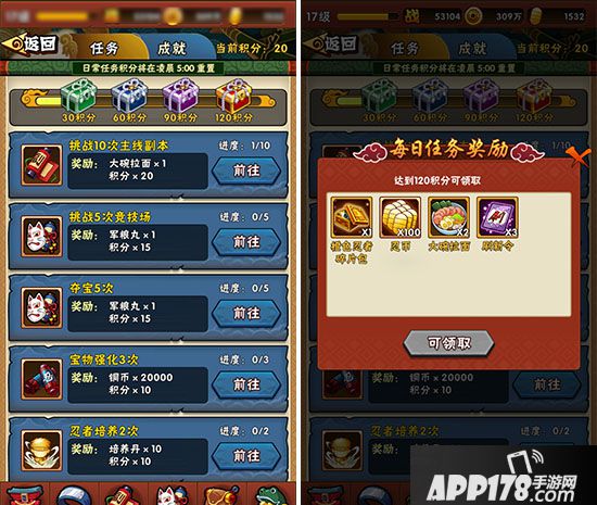 除了副本闯关外,在《火影忍者-忍者大师》中还有每日任务,完成指定任务即可领取丰厚奖励,何乐而不为呢。在每日任务系统中,分为任务和成就两大类,完成指定的任务,不仅能获得相应的通灵卷轴、军粮丸、铜币等奖励,达到一定的积分还可以获得稀有橙色忍者碎片和忍币哦!
