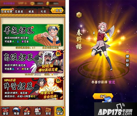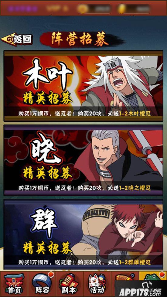 当玩家初入《火影忍者-忍者大师》时,系统将会指引大家进行首次免费抽卡。说好的后宫团当然不能食言,除了赠送的紫卡雏田,首次高级招募必然会抽中鸣人初恋小樱。即可激活鸣人的爱人和初恋羁绊,带来生命和防御的加成。游戏内将首先为大家开启普通招募和高级招募,普通招募每日有三次免费抽卡的机会,可招募绿色、蓝色、紫色的忍者。每次抽卡间隔10分钟,当然玩家也可利用通灵卷进行抽卡。而高级招募每46个小时将有一次免费招募资格,有机会获得蓝色、紫色、橙色的忍者。如果玩家升级为v6,还可开启绝对爽到爆的阵营20连抽,进行木叶、晓、群雄三大阵营的精英忍者招募!