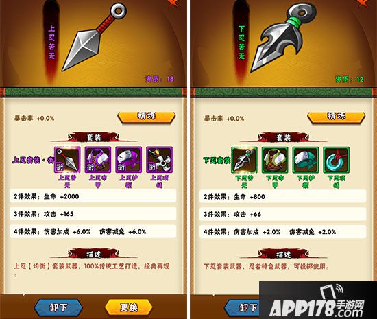 装备是《火影忍者-忍者大师》中忍者强化的关键之一,是忍者成长过程中提升战力必不可少的部分。每个小伙伴都可装备武器、护额、项链、防具四件装备,玩家可在副本闯关以及游戏内火影之路中的历练商店中获得装备。同时,装备也可进行强化和精炼。在游戏的阵容界面中,可查看装备相关属性,进行装备的强化和精炼。装备系统中还分为下忍套装、中忍套装、上忍套装和影级套装,佩戴装备套装,还能有额外的属性加成。