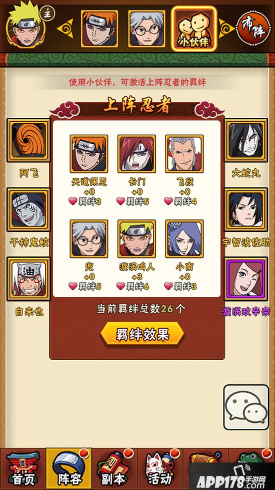 在晓阵营中,不难理解以上阵容的搭配初衷。佩恩与小南、飞段与长门和阿飞、小南与自来也、兜与佐助和大蛇丸,都将激活羁绊带来强大属性加成。