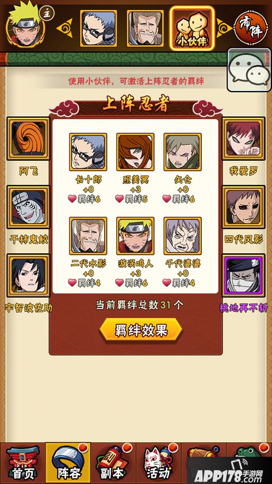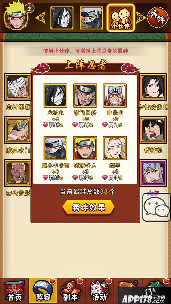 纲手、大蛇丸、自来也作为木叶传说中的三忍,三人同时上阵将激活“木叶三忍”的羁绊,为三人同时带来20%的生命值提高、20%的攻击力提升。而卡卡西与猿飞日斩、迈特凯、波风水门都存在羁绊,志村团藏与猿飞日斩、佐助与大蛇丸、大和与卡卡西同上阵,也将激活羁绊,带来强大的属性加成。该阵容极大地激活了忍者间的羁绊,必然带来最强的战斗力!