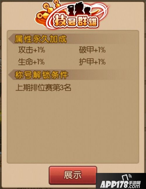 PS:并非只有五星才有奖励哦,每一星都有奖励,具体详见游戏~还有就是每一赛季(半个月)结束后,竞技榜前三的高手可获得独一无二的称号~另外,达到全服巅峰(前100)的玩家还可另外获得一份奖励哦!