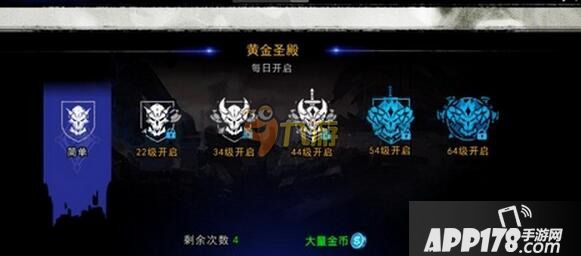 黄金圣殿中可以获得大量金币,每天可以挑战5次,角色等级越高,开启的黄金圣殿等级也就越高,12级开启简单,每次4600金币,22级开启普通,每次6900金币,34级开启困难,每次10000金币,44级开启噩梦,每次15000金币,54级开启地狱,每次23000金币。