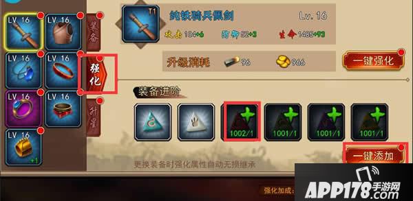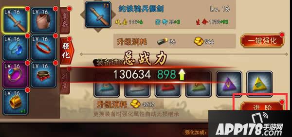 点击主界面上的装备,选择强化页签,选择需要进阶的装备,凑齐相应的材料,即可进行装备进阶。详细如下: