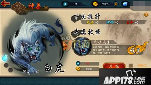 神兽共有白虎、朱雀、青龙、玄武四种,设置不同的神兽对武将提升的属性有不同的加成。