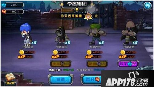 人物角色到达一定等级会开启学痞集团功能。派遣小弟出去收保护费,倒计时结束就可以收获经验和金币奖励了。小弟的级别越高,预期经验收益越高,所以学痞集团是一个弯道超车的升级所在哦。尽早将小弟升级到更高等级,你就可以赢在起跑线上甩他人一大截儿啦!(嘘,小声点……)