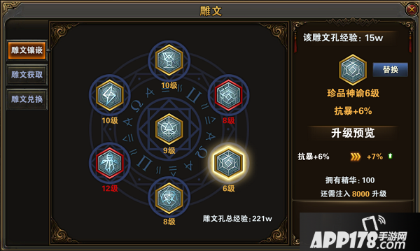 雕文拥有各种职业所需求的属性,玩家可以根据自身职业需求属性镶嵌雕文,每个玩家可镶嵌7个雕文,雕文登记越高属性越高。