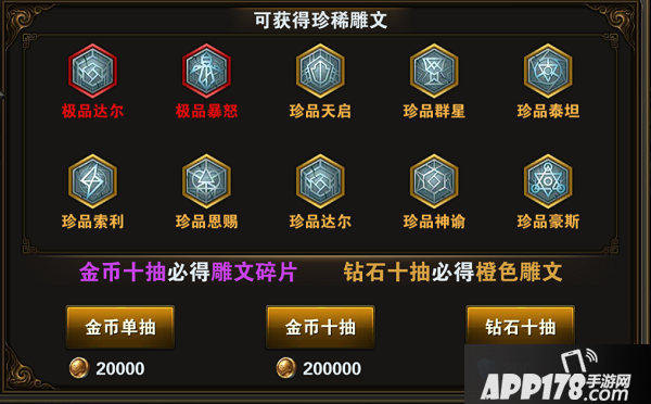雕文获取途径分别有金币单抽抽、十连抽,还有钻石十连抽,雕文品质分为3种红色品级做好!