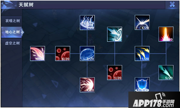 《绝对领域极战纪》天赋树分为三类:哀嚎之树、地心之树、虚空之树。每颗天赋树上各有11种天赋,每种天赋最高可升到20级,三类天赋树仅在生命天赋的数量上有细小的差别。尽管每种天赋树升级天赋所需要的资源都不尽相同,但升级后所获得的战力加成是相同的。其中,哀嚎之树的升级需要金币与经验;升级地心之树需要金币与光魂;升级虚空之树需要金币与星灵。
