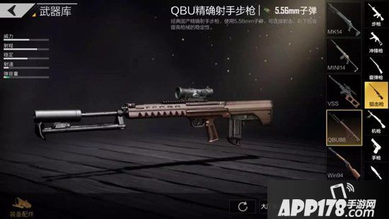 QBU的定位跟Mini14一样都是精确步枪,因此可以连射。QBU使用的配件跟Mini14一样,只有瞄准镜、枪口以及弹匣,但是QBU的伤害比Mini14相比会高一些,所以这两把还是选择QBU会好一些。