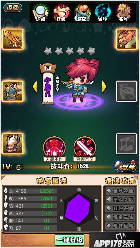 在《绝代双骄OL》中,每个侠客都有6个装备位,装备部件包括:武器、坐骑、披风、衣服、鞋子、项链。装备属性主要包括生命、内力、攻击、防御、命中、暴击、闪避等。想要提升人物战力,离不开装备强化系统。