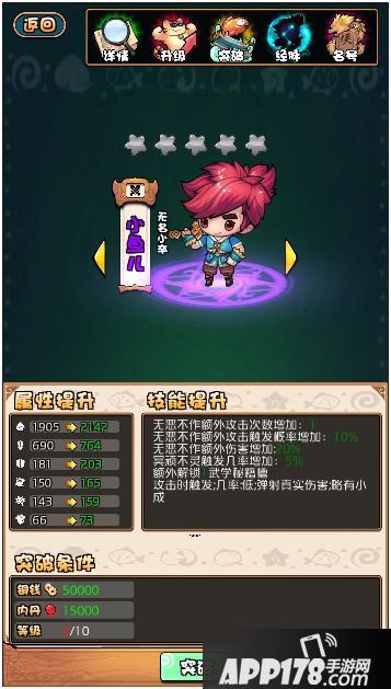 侠客突破除提高攻击、防御、血量等属性外,还将提升技能等级,不同侠客的技能秘籍不同,可在侠客突破界面查看,。武将突破消耗道具可通过完成爬塔活动获得。