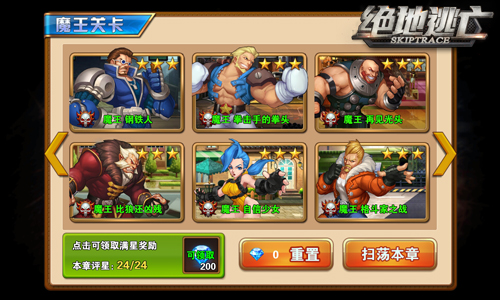 当达到一定等级后即可解锁精英关卡和魔王关卡,随着玩家等级的提升,解锁的关卡也会随之越多,且每个精英关卡、魔王关卡每天有1次的免费挑战机会。友情提醒:当每章关卡(主线关卡、精英关卡、魔王关卡)达到满星后即可丰厚的钻石奖励!