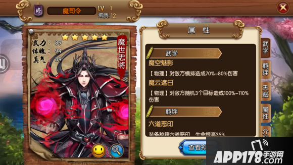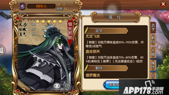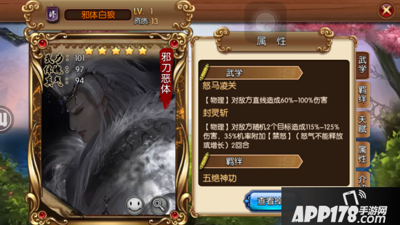 评语:黑白郎君恶体,配合幽灵魔刀能相当于激活两个羁绊,各属性都不差,有防能攻,战力强,能配合网中人,黑白郎君激活羁绊,很好用的13资质武将。