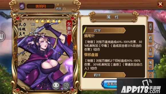 评语:武学有一些可取之处,但是天赋太杂,只能用做红将的羁绊人物吧。