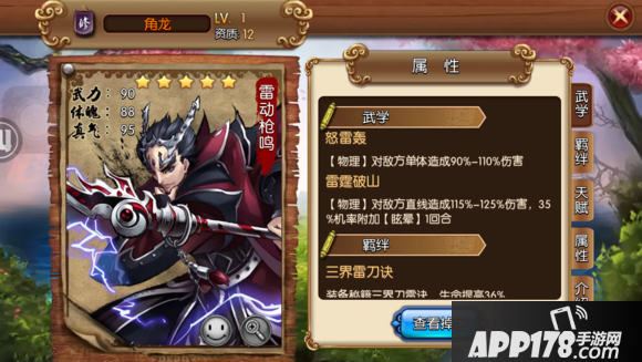 武学特性:怒技随机对敌方三位武将造成伤害附加25%晕眩几率,几率不高,还行吧。
