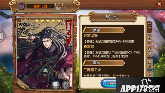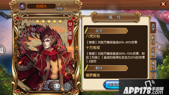 武学特性:怒技敌方横排伤害并附加灼烧效果(造成灼烧单位攻击力25%的伤害)2回合,很牛逼的伤害技能,同时三位敌将并几率灼烧两回合伤害非常可观。