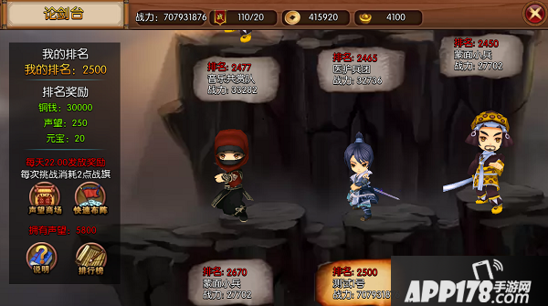 ▲别人的失败就是我的成功!在论剑台使用战旗点数和其它玩家比拼战力,排名越高每日结算奖励也越大。