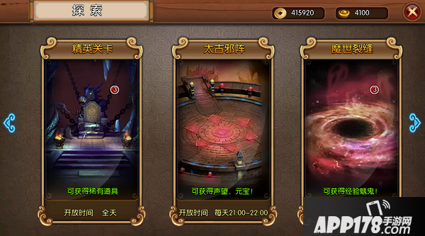 除了在剧情模式赚取升级所需的经验和道具外,探索模式也有许多副本,像是可以累积大量铜钱的琉璃树、能大量提升角色经验值的魔世裂缝以及有机会找到金元宝的九界等,每一项都可以让大家赚过瘾。