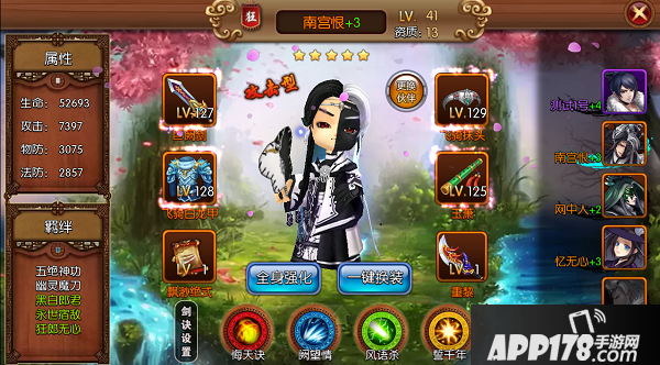 ▲装备等级、套装效果以及与角色间的羁绊关系亦会影响整体战力。一般来说只要按「一键换装」系统就会自动挑选出最佳组合穿上。