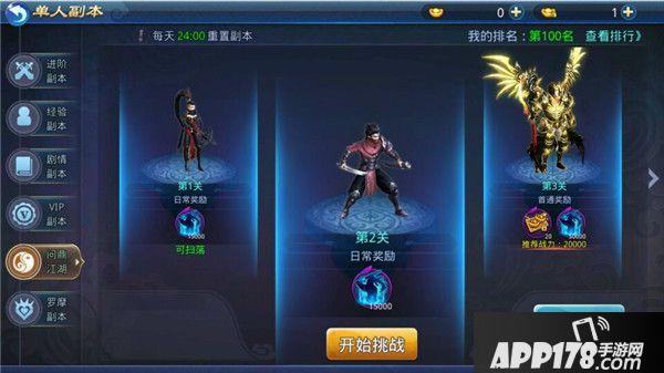 问鼎副本是一个指定时间内单挑BOSS的爬塔副本。选择单人副本→问鼎副本,打开副本界面。