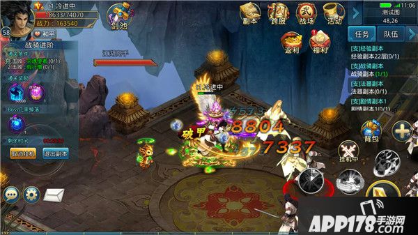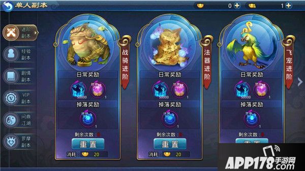 进阶副本是人物成长、战骑进阶、神兵升级等道具的重要来源之一。选择单人副本→进阶副本,打开副本界面。