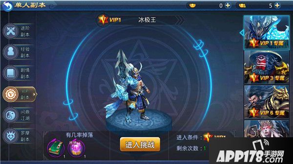 VIP副本是仅对VIP玩家开放的资源副本,VIP等级越高,开放的副本越多。选择单人副本→VIP副本,打开副本界面。