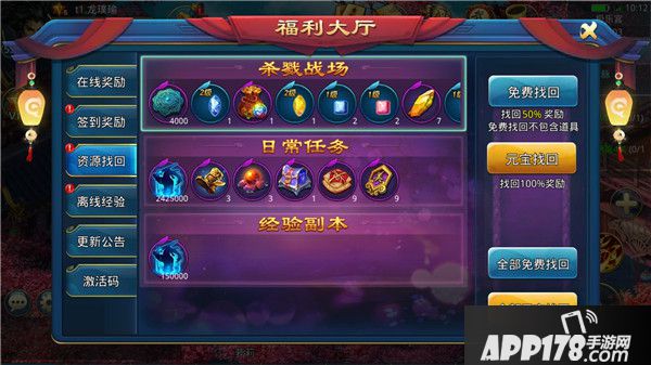 每日资源找回可以一键找回前一天未完成的任务、副本经验和道具奖励,元宝找回更能找回多倍奖励。