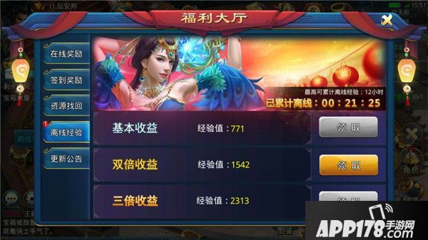离线系统自动累积经验,最高可达12小时,还能领取多倍收益。