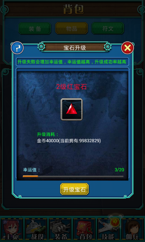 2、若升级失败会增加幸运值,幸运值越高,升级成功率越高。