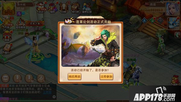 玩家到达35级即可参与蓬莱论剑活动,蓬莱论剑活动于每周的周二、周五的21:00开启。玩法开启后所有35级以上的玩家都将收到蓬莱论剑活动的弹窗,点击立即参加即可进入到蓬莱阁。