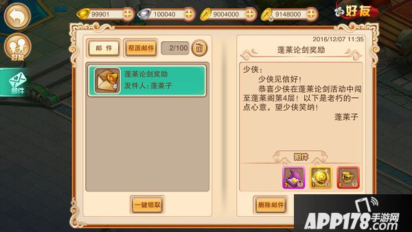 在蓬莱论剑活动结束后,将按照玩家当前所在层数给玩家发放奖励,奖励将以邮件形式进行发放。