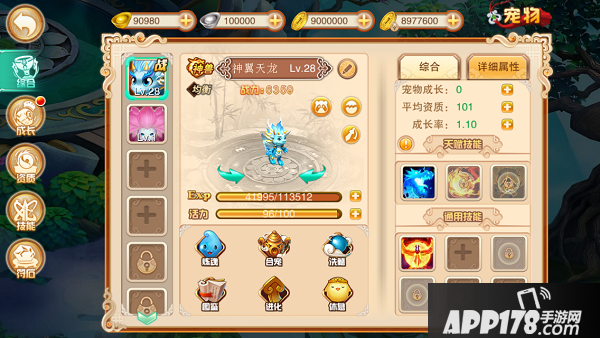 首先,宠物的初始成长很垃圾,需要【洗髓】。前期做任务系统会赠送许多洗髓丹,随便用用就能洗到不错。洗髓应优先关注【成长率】,尽可能高。其次是这只宠物的主要属性初值,例如熊猫是体,莲花是攻。其他的属性相对不重要。