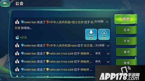 作为会员,你可以查看公会动态,包括玩家加入、离开、晋升,还能查看同一公会成员对中立国度的进攻、野外PK结果等。