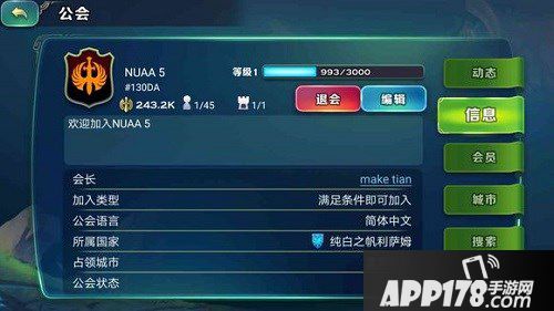 会长具有权限更改公会信息,在公会信息系统中,点击编辑按钮,可以会长修改公会名、公会图标、公告栏文字、加入类型、公会语言等。